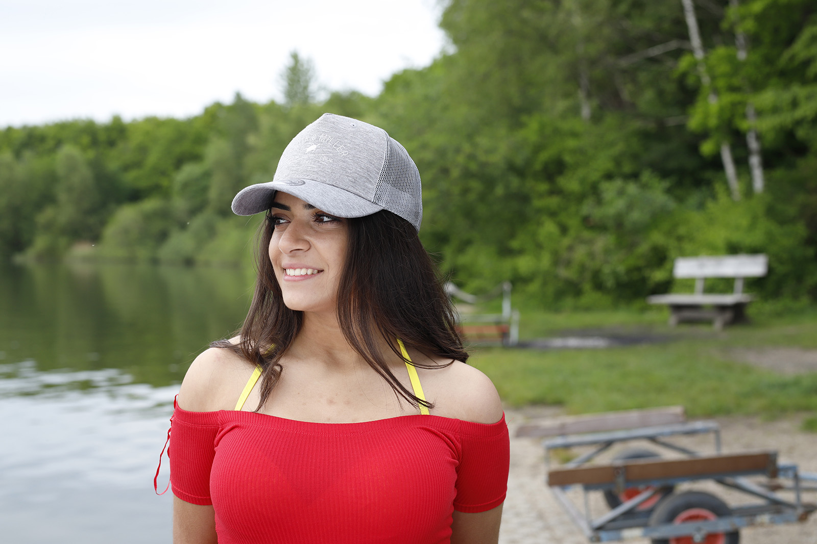 Unisex Trucker Cap mit einem gebogenem Schirm.